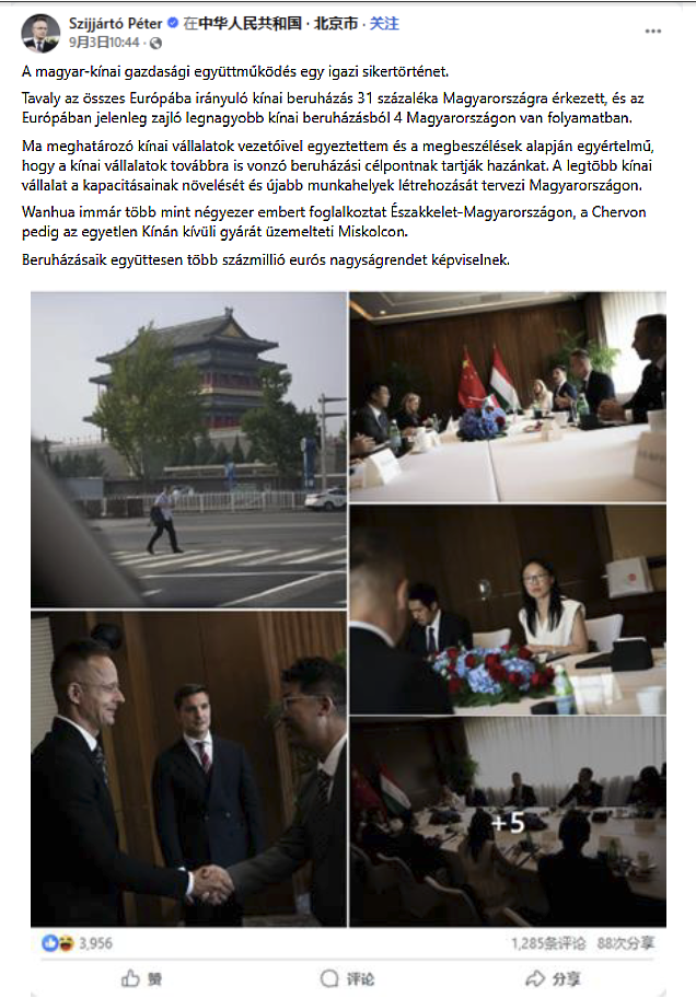 2025年9月3日,匈牙利外交與對(duì)外經(jīng)濟(jì)部長(zhǎng)西雅爾多在北京參加完紀(jì)念中國人民抗日戰(zhàn)爭(zhēng)暨世界反法西斯戰(zhàn)爭(zhēng)勝利80周年閱兵活動(dòng)后,同在匈牙利投資的中國主要公司領(lǐng)導(dǎo)人進(jìn)行了會(huì)談。